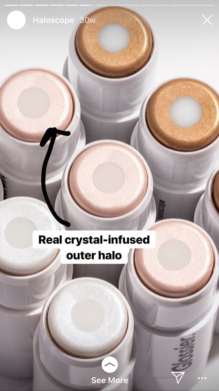 Likewise, @glossier uses Instagram Stories Highlights to feature specific products, like Haloscope. Throughout the highlight, Glossier includes swipe up links to drive traffic to their online store where people can actually buy the product!