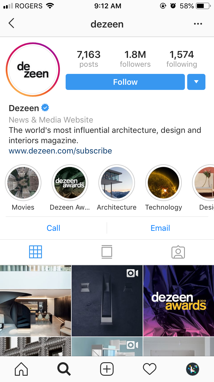 Architecture and design publisher @dezeen uses their Highlights to categorize their content based on their audience's interests, including "Interiors," "Design," "Architecture," "Technology," and more.