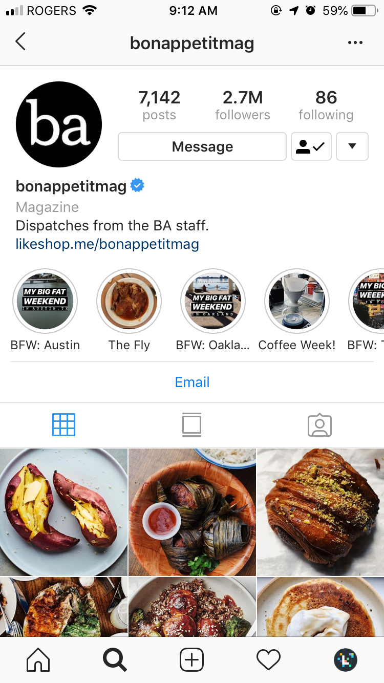 For example, @bonappetitmag does this often, creating separate Highlights for their content series like "BFW" (Big Fat Weekend) and the various locations they cover it: