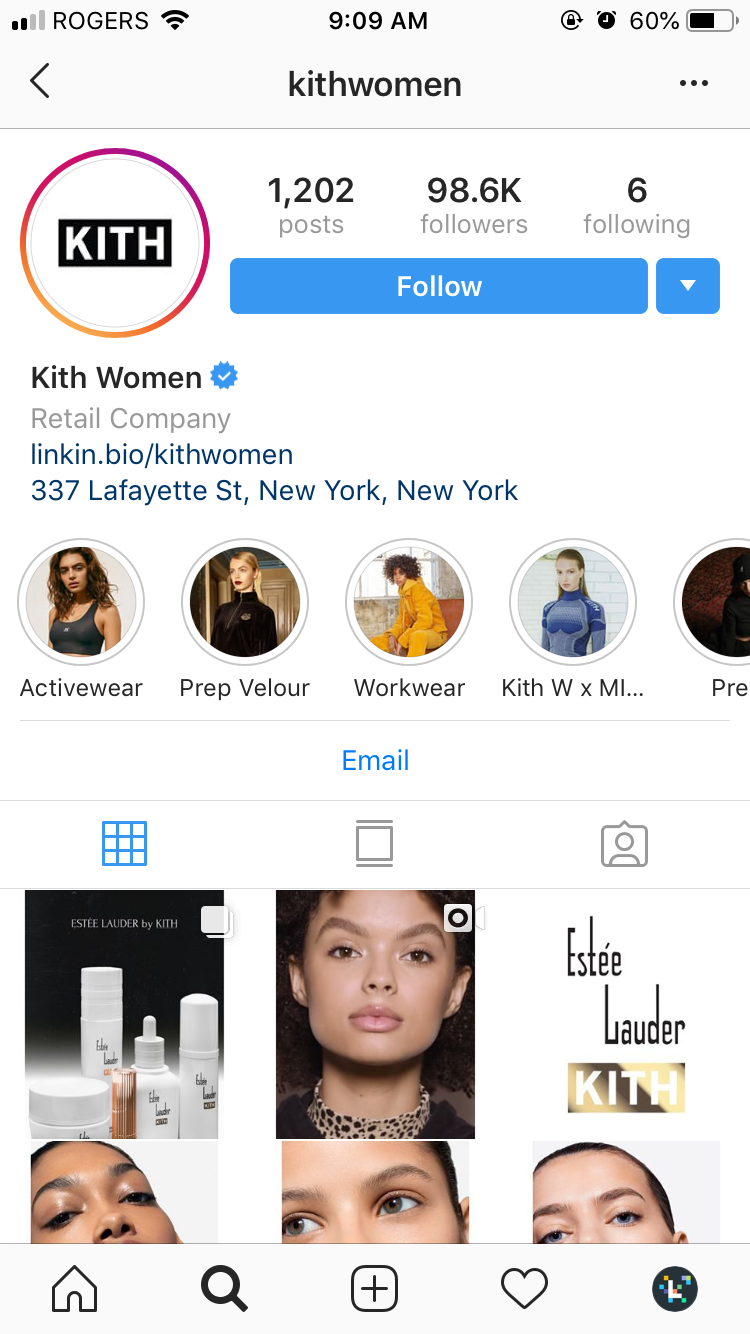 The New York-based streetwear brand @kithwomen uses Instagram Stories Highlight to showcase its product collections, including activewear, workwear, collegiate, and more.